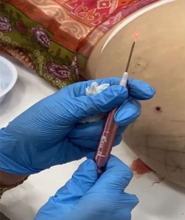 All necessary precautions were taken to protect the adjacent tissue from unintended damage, since the high temperatures of the laser could injury those which are not targeted by the procedure. The use of a needle guide was essential to provide this protection10.
