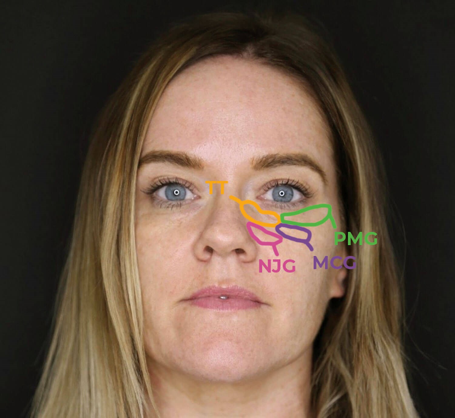 Figure 2: Image of patient demonstrating the locations of the nasojugal groove (NJG), the tear trough (TT) groove, the palpebromalar groove (PMG) and the mid-cheek groove (MCG).