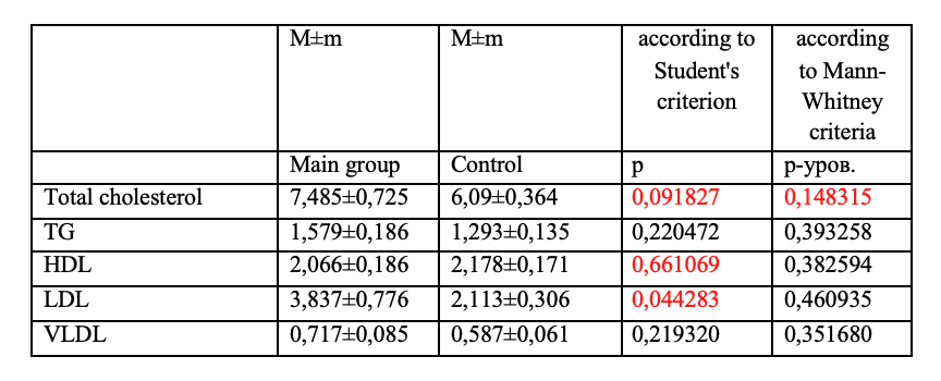 The content of total cholesterol, TG, HDL was determined by the enzymatic colorimetric method using the ChronolabAG kits (Switzerland), LDL - by the turbidimetric method, very low density lipoproteins (VLDL) - by the TG/5 calculation method. Statistical processing of the obtained data was carried out using Microsoft Office Excel 2007 (Microsoft Corp., USA) and Statistica 10.0 (StatSoft Inc, USA). The data are presented as M ± m, where M is the average value of the feature, m is the average error of the feature, as well as an expression of the frequency of occurrence of the feature in absolute values (n) and percentages (%). The significance of differences between the subgroups was assessed using Student's T-test. Correlation analysis was carried out to determine the relationships between different parameters. The threshold level of statistical significance was p < 0.05. The Mann-Whitney test was used for comparative analysis of absolute differences between samples.