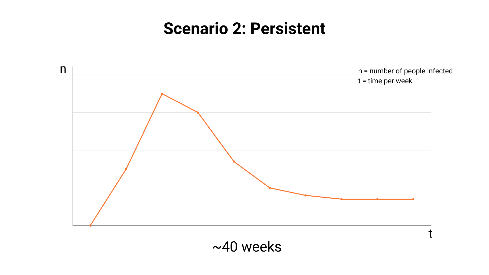The second scenario is a version where we have the peak, but we learn to manage and maintain a plateau. This would mean that the virus will stay with us for a long time but we will have the right measures stabilize the rates.