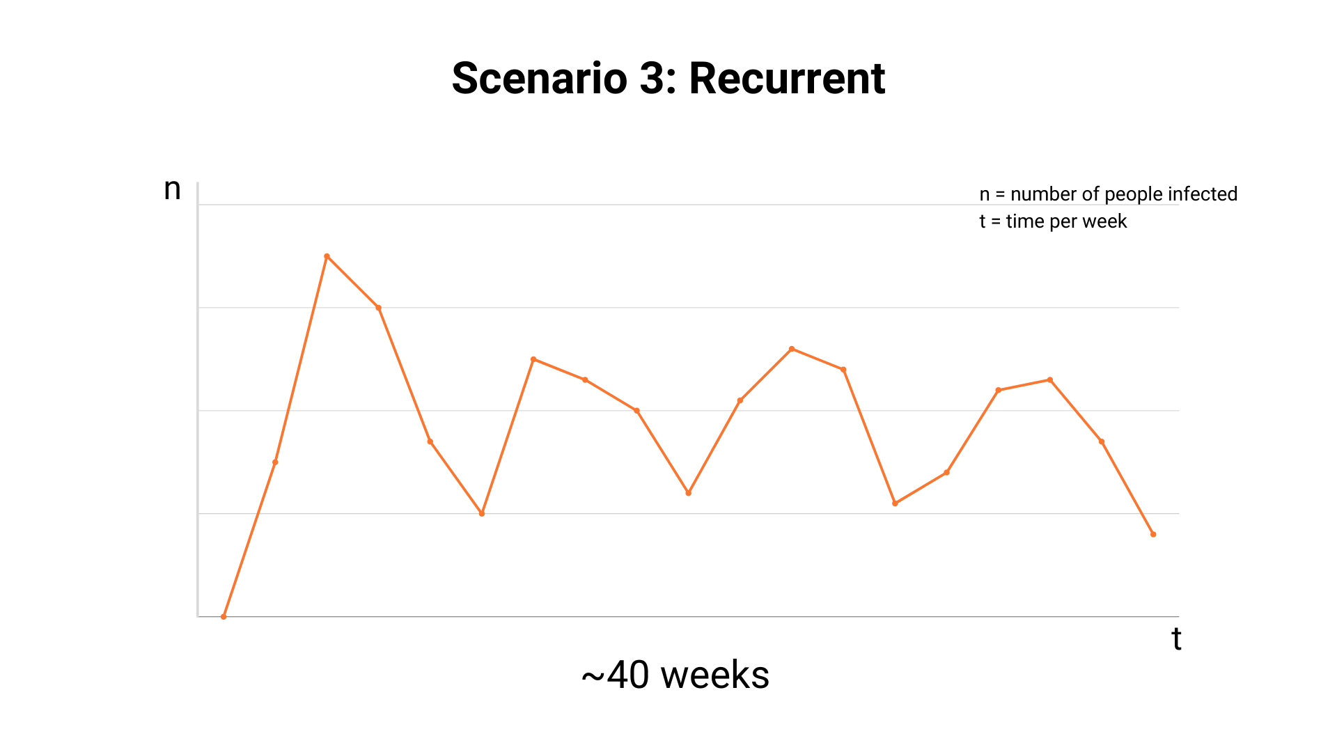 The third scenario is that the virus will recur in episodes repeating every 6 to 9 months.