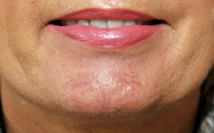 Figure 1: Telangiectasia (thread veins) on the chin as distinct veins in a group. Suitable for treatment with advanced electrolysis/radiofrequency (electrocautery) or transdermal laser.
