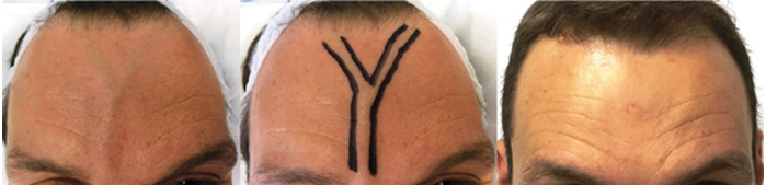 Figure 6: Forehead veins, bulging and too deep to see any colour. Suitable for phlebectomy under local anaesthetic, a far more complicated procedure than phlebectomy elsewhere on the body due to the muscles of facial expression inserting into the skin.
