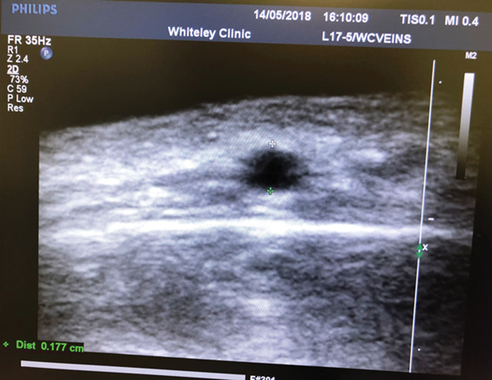 We prefer phlebectomy using local anaesthetic (lignocaine) with adrenaline (epinephrine) to reduce bruising. Incisions are made using the smallest possible blade and in line with where skin creases will develop if there are none present. Of course if there are skin creases already, incisions should be made within these. Phlebectomy hooks can be used but it should be noted that these veins are very small and difficult to remove. They are often adhered to the skin and access with the hook is difficult due to the muscles of facial expression (frontalis muscle on forehead) inserting into the skin around the vein. With experience, good results can be obtained (Figure 6) but we have found it is a long learning curve to get good at this and so we restrict the practice to one surgeon in our clinic. In addition, we have ready access to vascular ultrasound which is helpful in identifying the position of veins, checking there is no arterial flow and ensuring that there is no abnormality associated with the target vein (Figure 7).