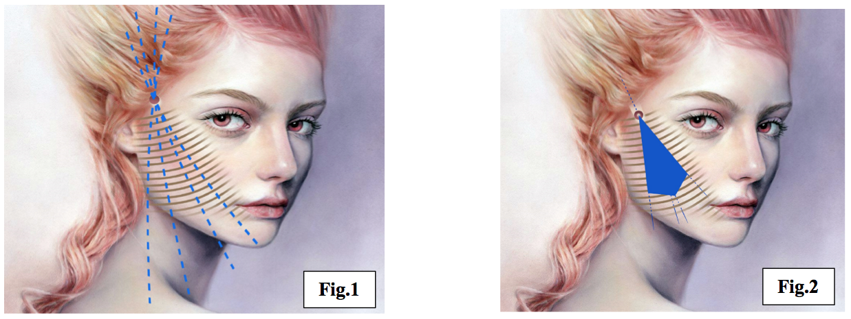 Sector 2 is the area where ptosis usually happens. Vertical traction is what I do. Since it is known that sectors 1 and 3 are a good place to anchor sector 2, then I put the thread as a medium to hook the subcutaneous layer and anchor sector 2 to sector 3 for a homogenous pull. The customary thread lifting that I used needs a small incision using a scalpel (blade 11) but since my innovation, I no longer need to incise the area with scalpel. Instead, I use a g.18 needle to aid my needle to penetrate the area. The previous technique that I had use to give results that are inconsistent. The pull is a little irregular and it is bulky on the zygomatic region. I use to put 4 threads only in a triangular manner. Later I realized that in order to have a homogenous result, you need to think of the skin as a fabric that needs support, or else it will come loose and give you an irregular result. So instead of just pulling the skin with threads, make a mesh in a form of a pyramid to have a more satisfying and homogenous pull (see figure 1 and 2).