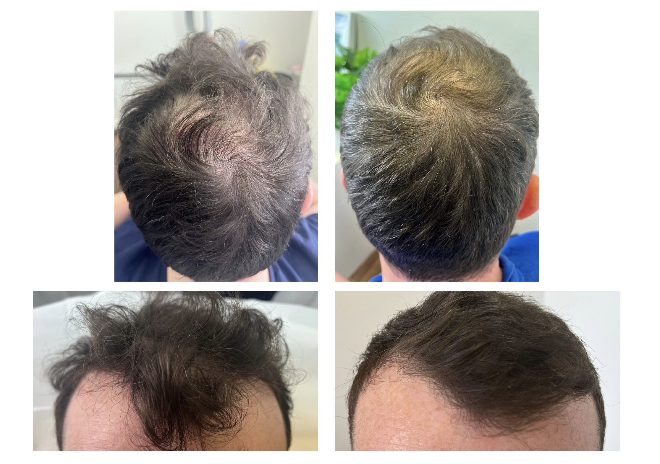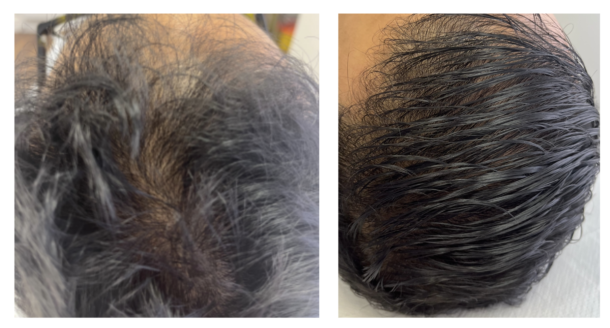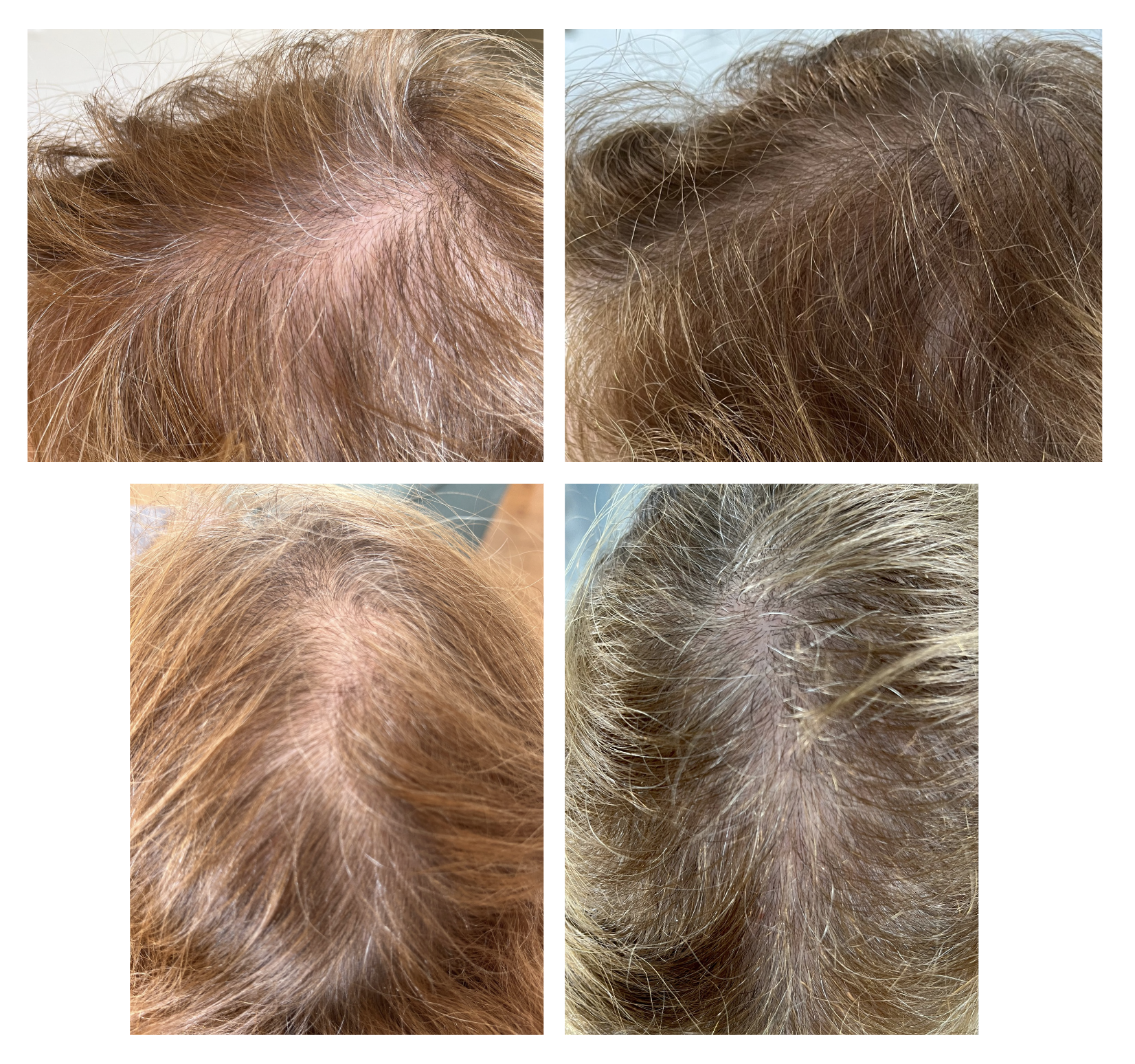56 y.o had 2 sessions of treatment. Before: Inflamed scalp with thinning and unhealthy hair strands. After picture taken at 8 weeks from first treatment. Scalp has calm and there is significant hair growth noted with improvement of colour and texture of existing hair.