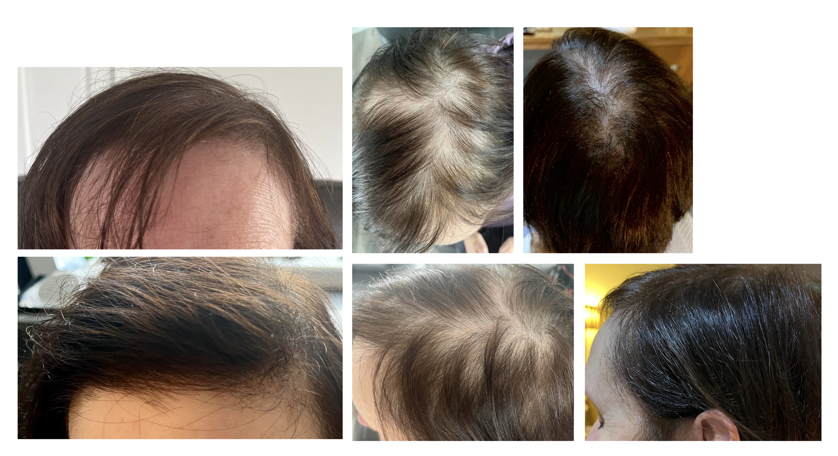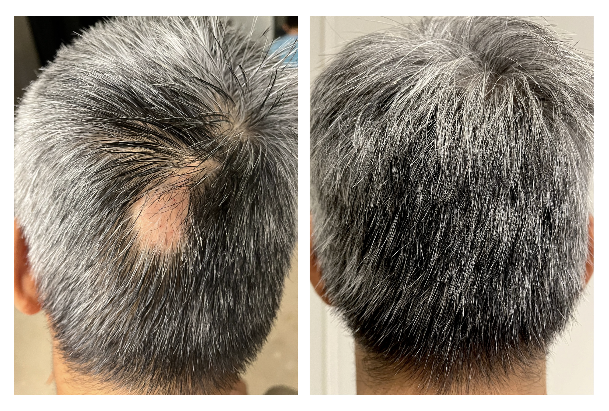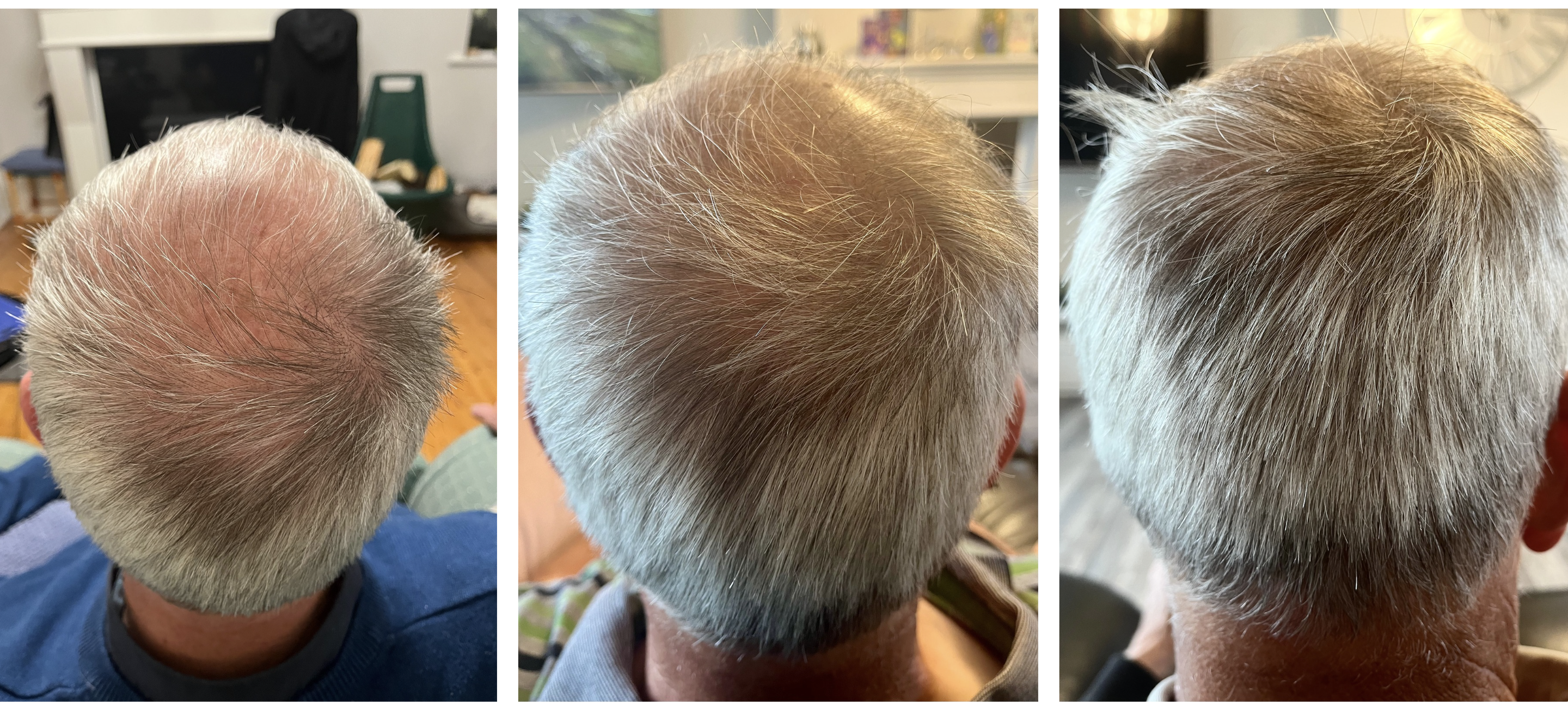 56 y.o had 2 sessions of treatment. Before: Inflamed scalp with thinning and unhealthy hair strands. After picture taken at 8 weeks from first treatment. Scalp has calm and there is significant hair growth noted with improvement of colour and texture of existing hair.