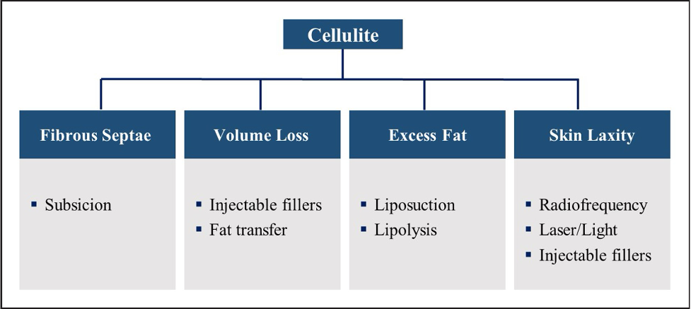 Figure 4. Cellulite treatment algorithm. Treatment is based on the underlying structural alteration of the fibrous septa and/or the exacerbating factors that worsen cellulite appearance-volume loss, excess fat, and skin laxity.