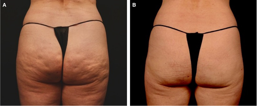 Figure 5. A 46-year-old female patient (A) prior to and (B) 9 months after cellulite treatment by manual subcision using the new FDA-approved device (Avéli; Revelle Aesthetics, Inc.). Note, no prior procedures had been performed on the buttocks.