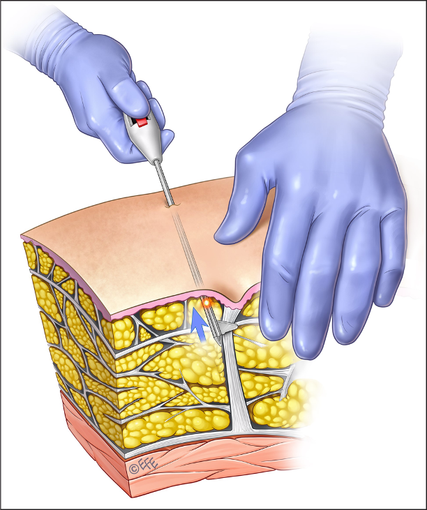 Subcision is recommended for cellulite depressions present at rest only and not for depressions that are visible with muscle contraction.9,48 It is a surgical technique that severs the fibrous septal bands tethering the dermis to the subcutaneous adipose tissue. With the severing of the fibrous septa, biomechanical forces within the subcutaneous layer are redistributed, fat lobules are redistributed into spaces created by the procedure, and fat protrusion is mitigated, resulting in a smoothening of the skin surface. Subcision can be performed manually or it can be vacuum assisted or laser assisted. More recent techniques include chemical subcision, using collagenase enzyme injections, and acoustic subcision.