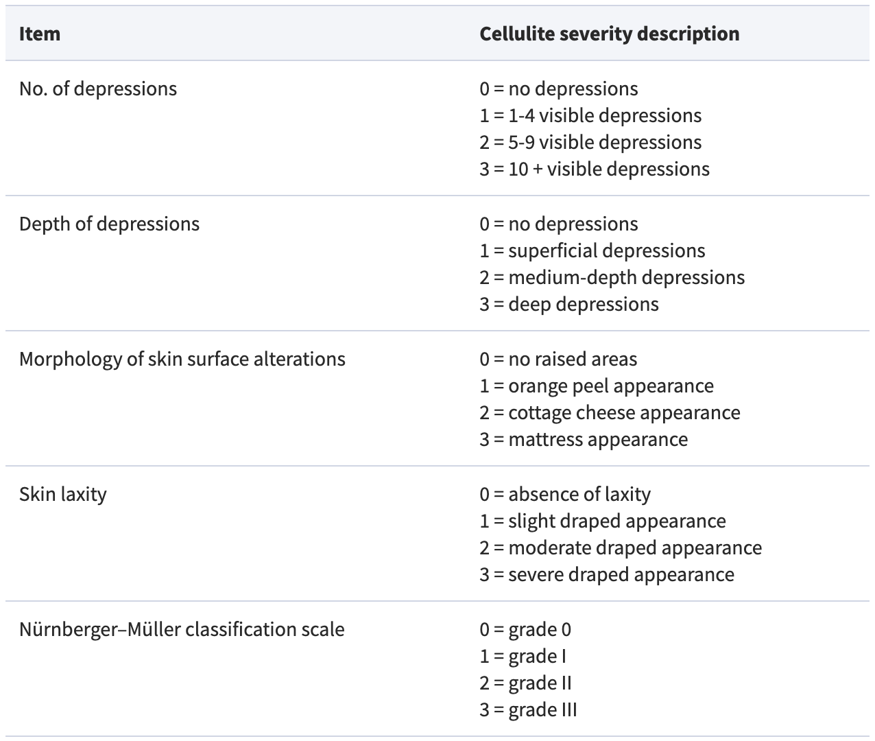 The severity of cellulite may be graded by using one of several validated scales that are available for this purpose. The Nuernberger–Mueller Scale and the Cellulite Severity Scale (CSS) are the most commonly used in clinical trials to evaluate treatment effect. The Nuernberger–Mueller Scale uses visual assessment of dimple severity and a pinch test of the skin to categorize skin appearance into 4 grades (0-III; Table 2).11 It is easy to administer without the need for a visual tool/scale; but is an unvalidated, purely qualitative scale.7