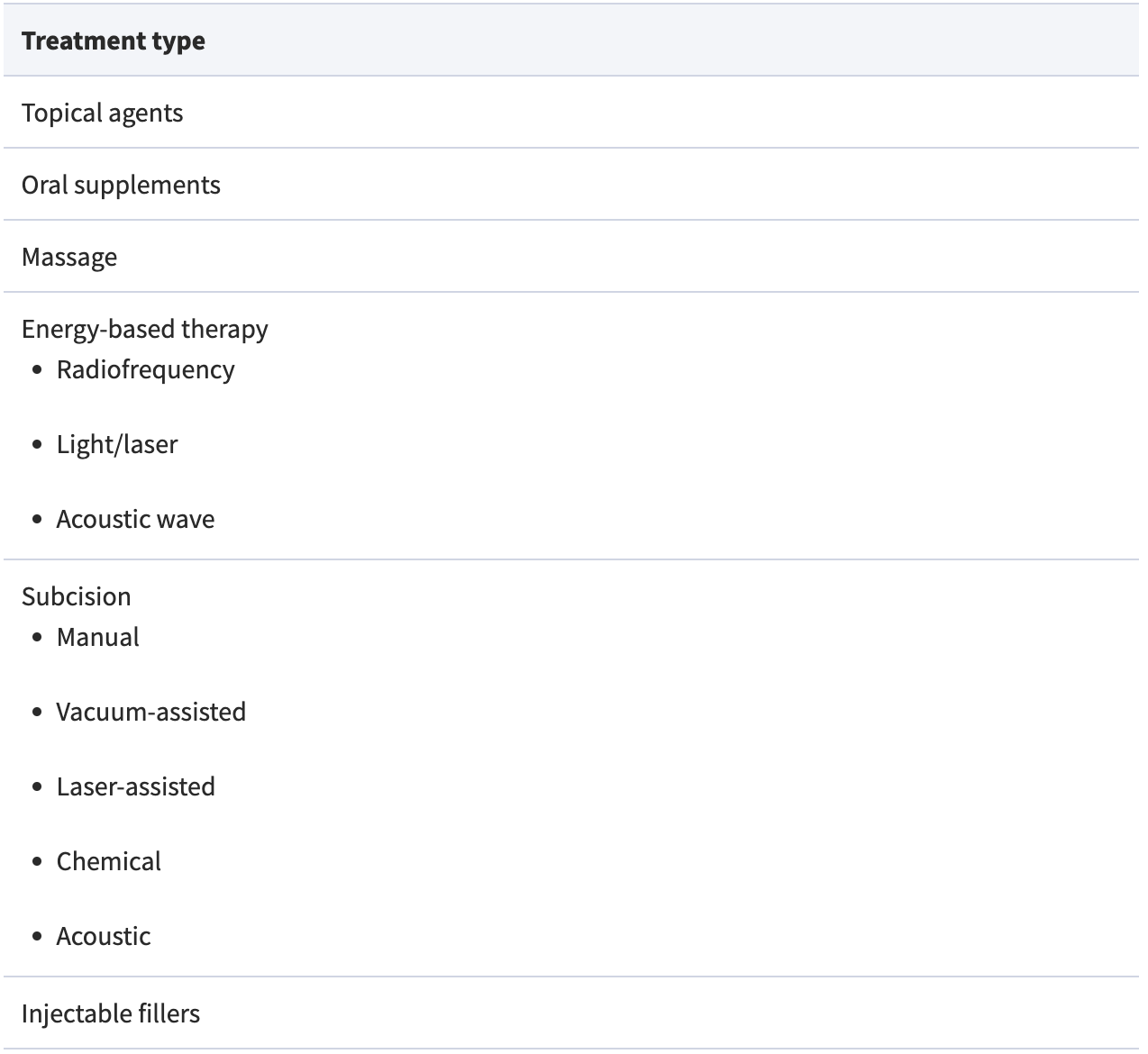 Many agents/devices targeting various steps/pathways implicated in the etiopathogenesis of cellulite are available to help treat or diminish cellulite appearance, including topical agents, oral treatments, massage, energy-based devices (radiofrequency [RF], laser or light therapy, and acoustic wave therapy), subcision, and injectable treatments (dermal fillers and biologics; Table 4).2,3,8,9,17,18 Among these, the earlier treatments, such as topical agents and massage, focused on addressing the underlying impaired microcirculation and drainage deficiencies. But as the understanding of the pathophysiology of cellulite evolved, later treatments, such as subcision, focused on addressing the architectural disturbances in cellulite.