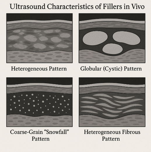 High-frequency ultrasound provides a non-invasive window for assessing filler location, distribution, and tissue response. Different filler materials exhibit distinctive echogenic patterns on ultrasound. In a seminal ultrasound study by Urdiales-Gálvez et al., four basic patterns were described1 (Figure 2):