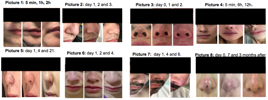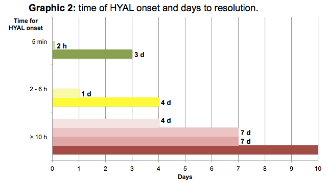 Sample characteristics and variables included are in Table 1 - mean age: 30,75 y. Different regions were affected (Graphic 1). The time for HYAL onset in each patient were different, as the time for total resolution (Graphic 2). Different oral medications (OM) were used. All patients had complete resolution. Pictures 1 to 8 show the cases.