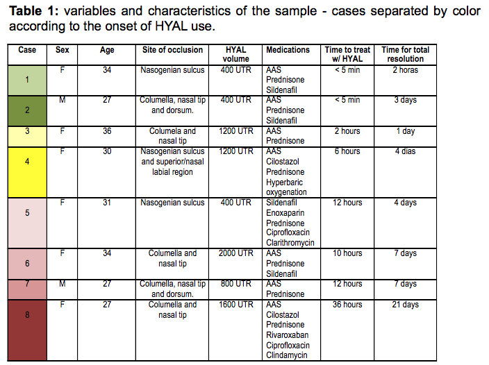 A case series made by the review of medical records of 8 patients who developed vascular occlusion after HA filling. Variables included: sex, age, site of occlusion, HA and HYAL volume, associated medications, time to start treatment and time to resolve the condition.