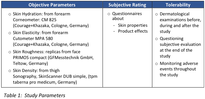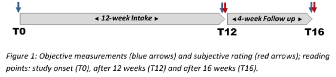 Effectiveness of products was measured objectively (relevant skin parameters, Table 1) under rested conditions of subjects and under stable physical environmental condition. After 12 and 16 weeks, participants filled out questionnaires regarding their subjective assessments of different parameters concerning the characteristics and performance of the product like efficacy, odor, taste, consistency or skin appearance. Tolerability was surveyed dermatologically and by questioning (Table 1). Study duration was 12 weeks plus 4 weeks follow up without intake of products (Figure 1).