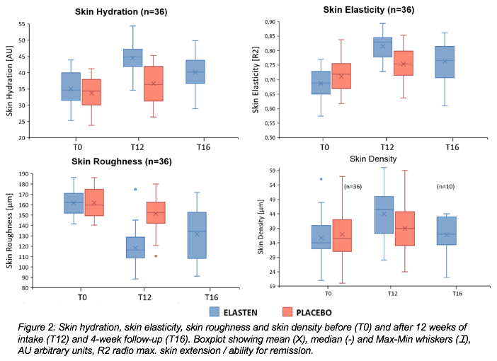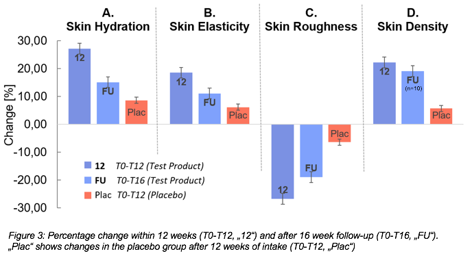 This placebo-controlled study demonstrates that oral supplementation with special bioactive collagen peptides combined with other dermonutrients significantly improves skin hydration, skin elasticity, skin roughness and skin density after 12 weeks of intake. These effects could be substantially retained during the follow-up and were confirmed in the self-perception questionnaires.