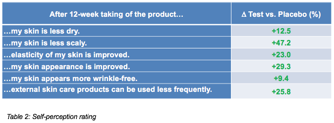 In comparison to placebo, after 12 weeks of intake the test product was superior in terms of improved skin hydration, skin elasticity, skin roughness and skin density (Fig. 2 and Fig. 3). Both products were very well tolerated. Dermatological examinations revealed no adverse effects, i.e. no pathological skin reactions, irritancy reactions or allergic reactions.