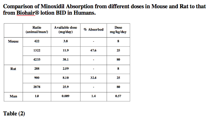 The following table provides a comparison of topically absorbed doses from a 2-year dermal carcinogenicity study in mouse and rat. Compared to results obtained from humans using the recommended twice daily dose of Biohair® lotion. The table demonstrate that on an mg/kg basis, the animals received higher doses than humans. In addition minoxidl in animals (in preclinical toxicity studies) is several hundred times greater than that associated with clinically recommended doses in man.